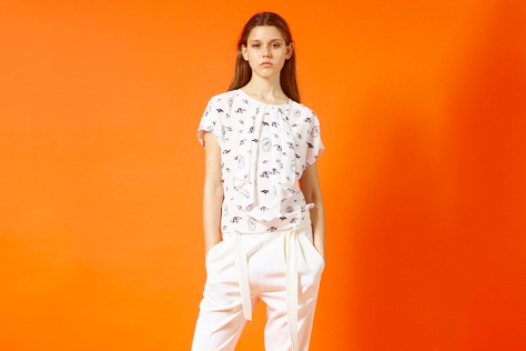 Die Modedesignerin Dorothée Vogel liebt bedruckte Stoffe und entwirft diese für ihre Prêt-à-Couture-Kollektionen selbst. Dabei kokettiert Sie gerne mit ihrem Namen. Für die Sommerkollektion 2015 hat sie zusammen mit Alexis Saile einen frechen Spatz kreiert und ihn für Blusen und Kleider auf leichten Crèpe de Chine drucken lassen. Sie findet, dass er sich auch gut auf ihrem Teller für Donate A Plate macht.
